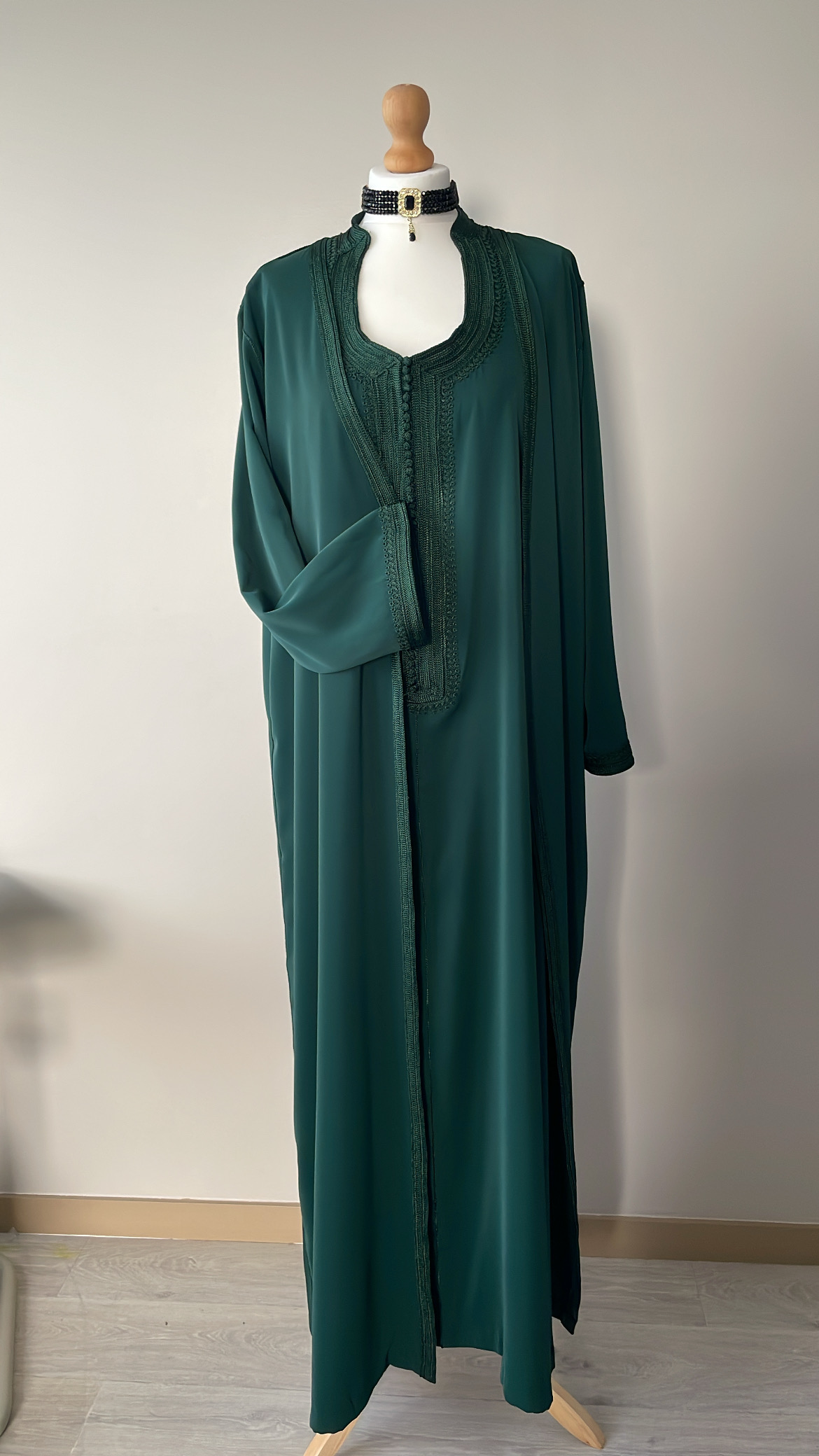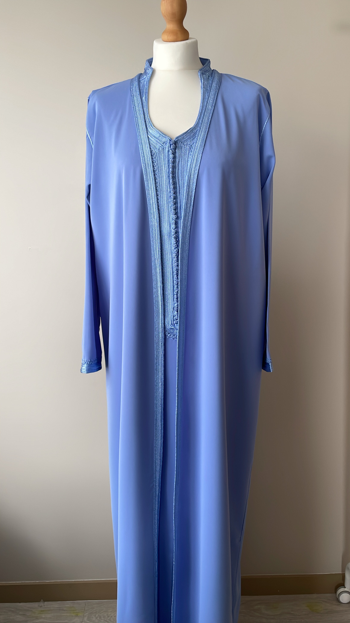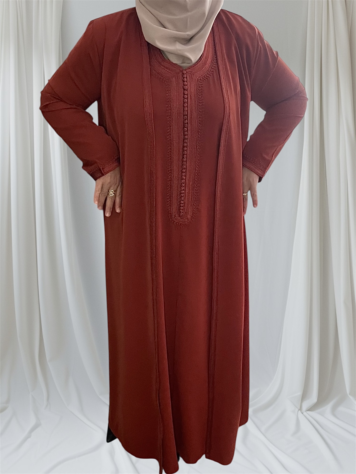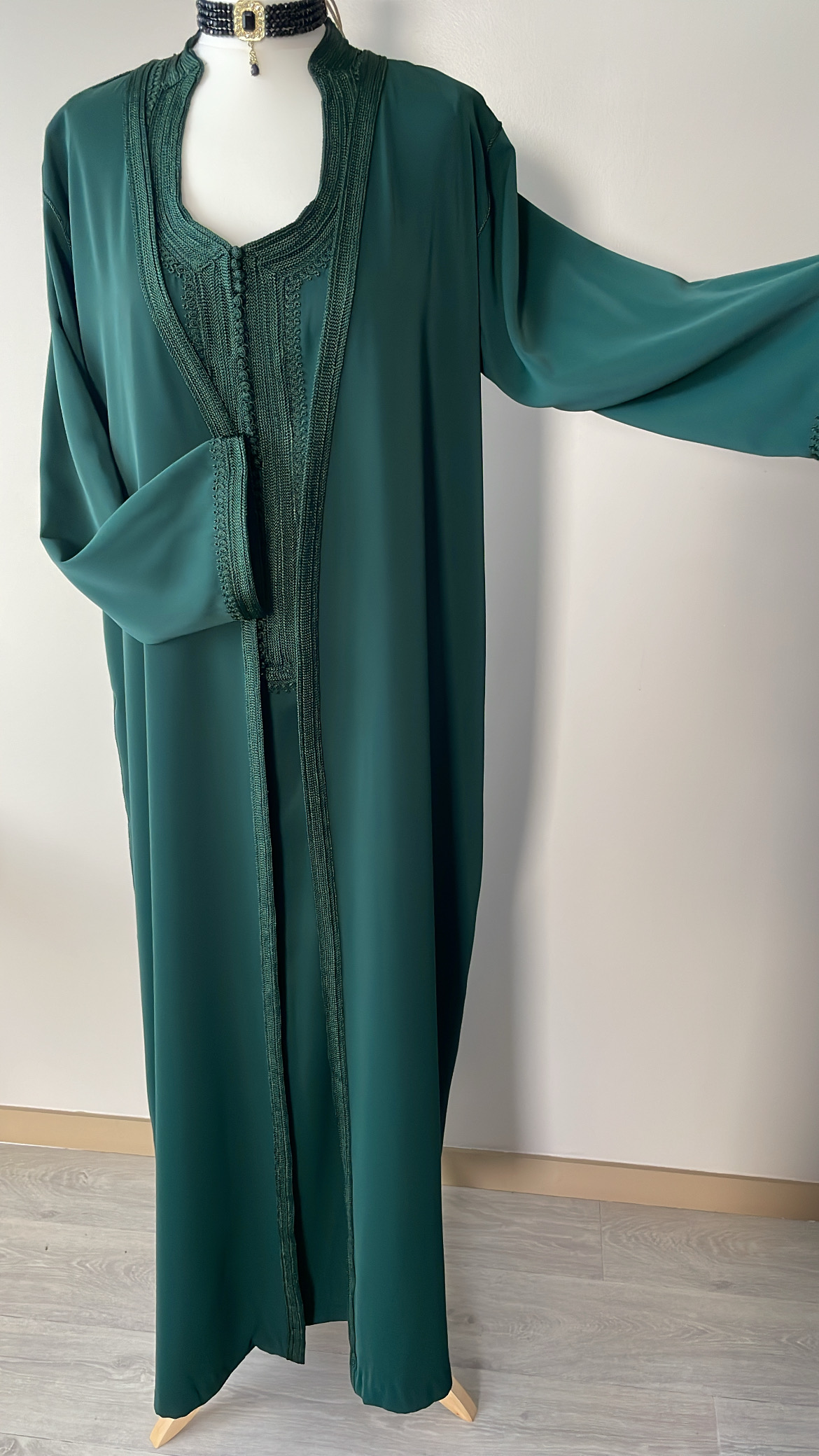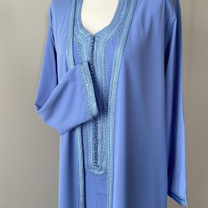 - un par-dessus ouvert avec manches longues brodées aux extrémités.