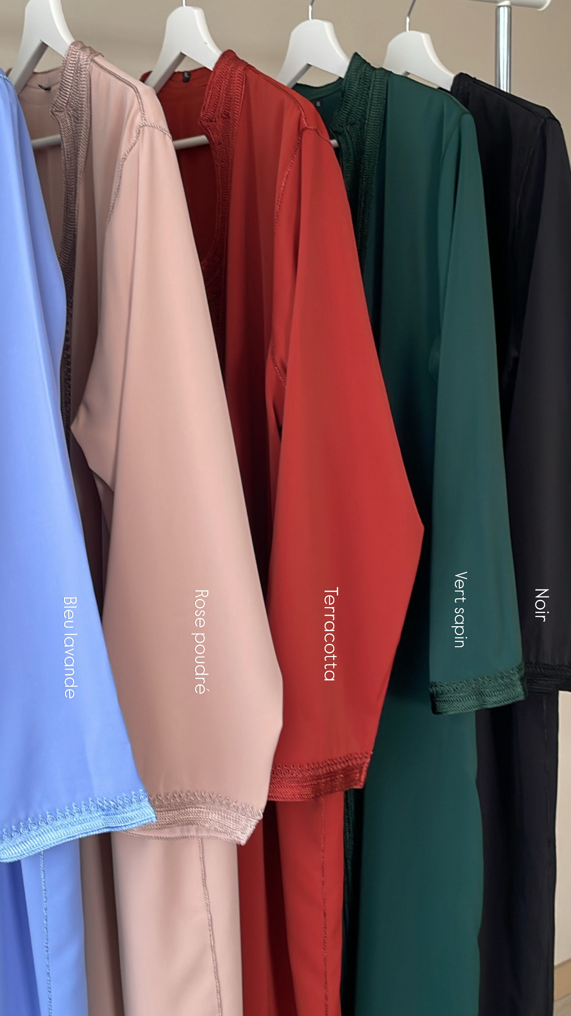 Disponible en bleu lavande, rose poudré, terracotta, vert sapin et noir.